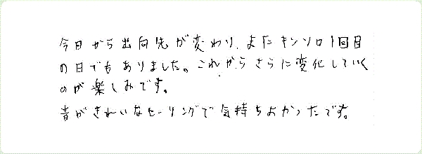 HOME > セッション > 提供終了セッション > 提供終了セッション セッションのご感想(miiさん・会社員) 2016/7/1 ★1回目 今日から出向先が変わり、また1回目の日でもありました。 これからさらに変化していくのが楽しみです。 音がきれいなヒーリングで気持ちよかったです。 ※ご感想は個人の体験によるもので、効果・結果を保証するものではありません。 -提供終了セッション